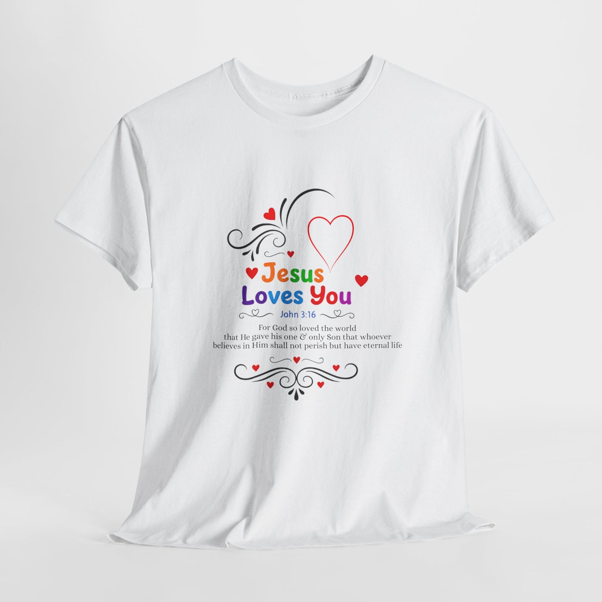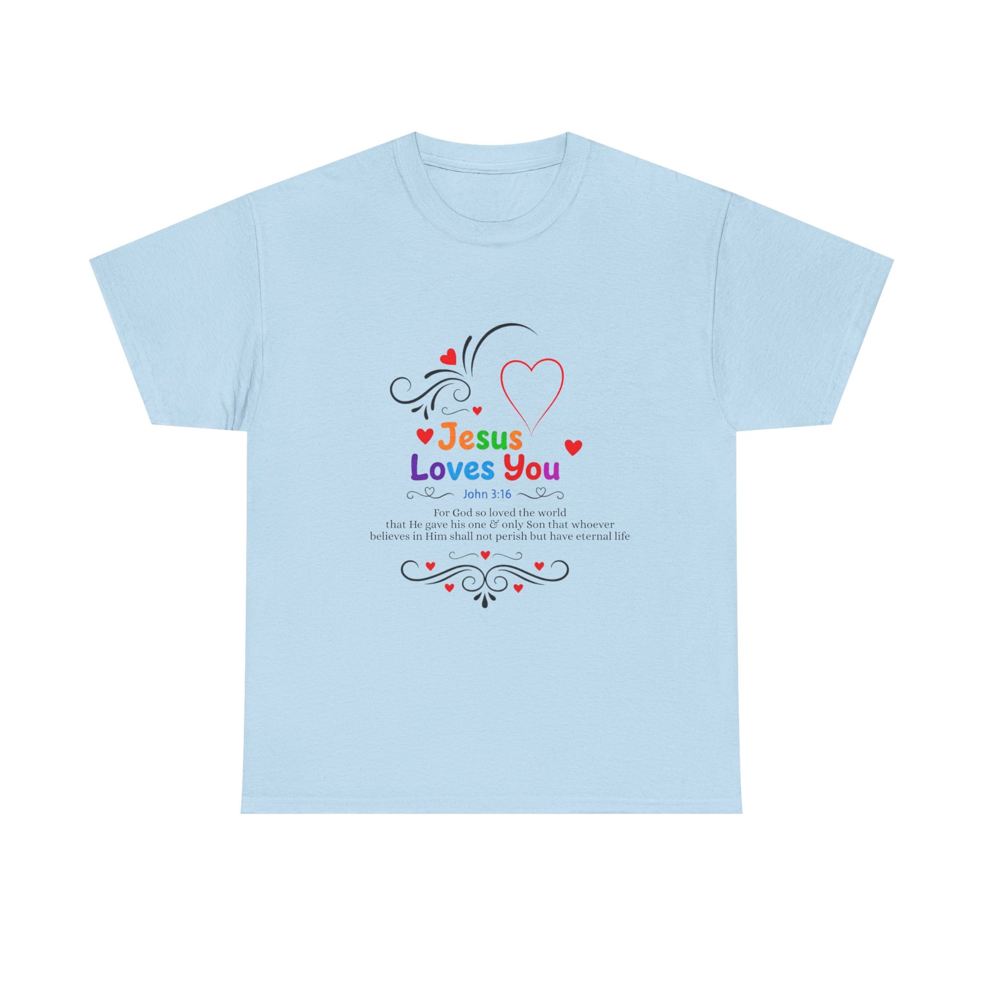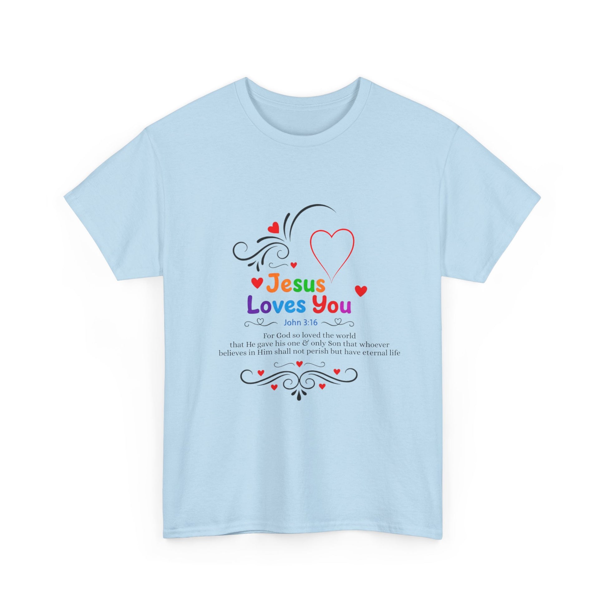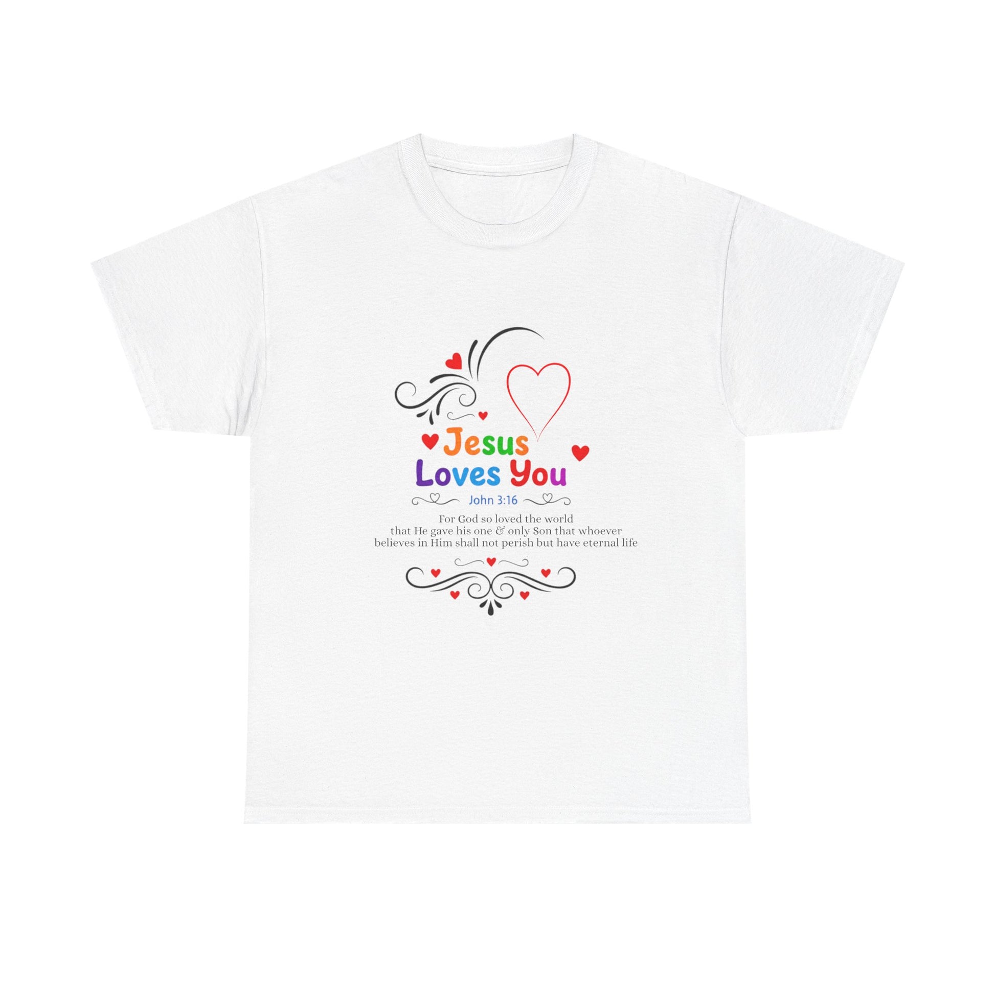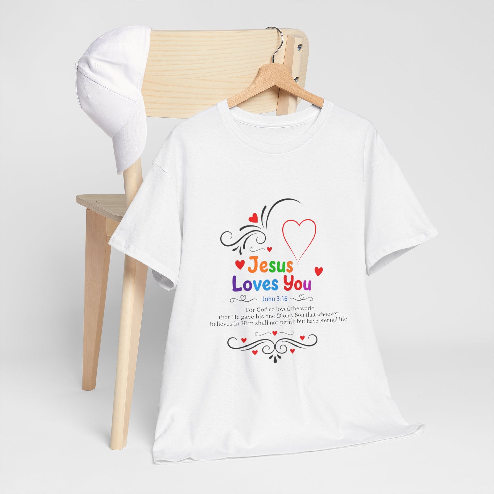 A soft, sturdy classic tee printed with a quiet, faith-forward message. The front features a simple pink heart above the words “JESUS LOVES YOU” with the John 3:16 verse rendered beneath in a clean, readable type. Lightweight but durable 100% cotton (solid colors) holds crisp DTG printing and keeps the neck shape thanks to a ribbed collar. The relaxed, timeless cut layers easily under jackets or stands on its own for church events, volunteer days, or everyday wear that speaks gently but clearly.